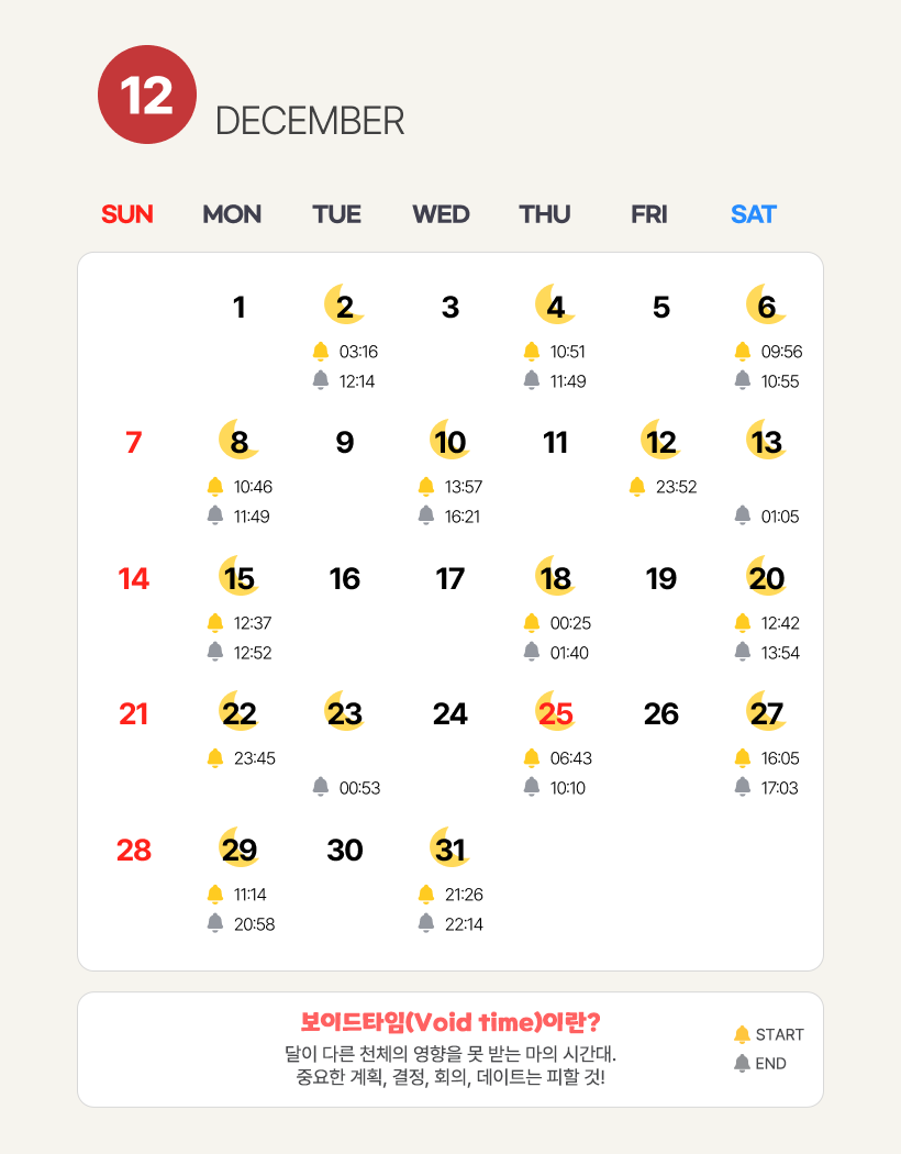 보이드타임이란 점성술에서 달의 영향력이 0인 상태로 달의 보호를 받지 못하는 시간. 사람들이 중대한 실수를 저지르기 쉬운 “마의 시간”이라고도 합니다. 보이드타임에 대한 자세한 내용은 예전 칼럼을 참고해 주세요.
