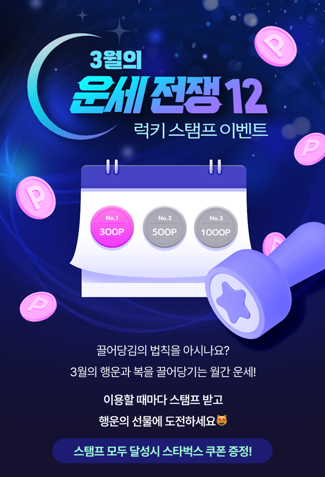 이벤트 Hot Poll 무료 감정 출석체크 3월의 운세 전쟁 12 럭키 스탬프 이벤트 끌어당김의 법칙을 아시나요? 3월의 행운과 복을 끌어당기는 월간 운세! 이용할 때마다 스탬프 받고 행운의 선물에 도전하세요 스탬프 모두 달성 시 스타벅스 쿠폰 증정! 내 포인트 보기 내 쿠폰 보기 #인생고민 스텔라 미드포인트 점성술로 보는 3월 운세 스텔라 점성술 10,000원 #인생고민 3월 나의 운명 어떤 길을 향해 나아가는 걸까? 프리미엄 동양운세 3,000원 #싱글 르노르망으로 보는 3월 만남운 르노르망 예언 타로 6,000원 #인생고민 사주로 보는 3월의 여행운 프리미엄 동양운세 2,000원 운세 더보기