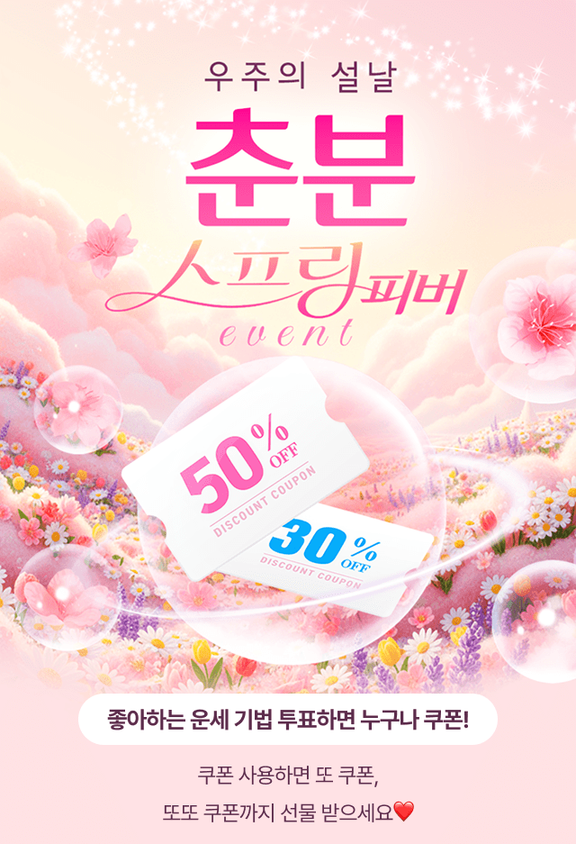 이벤트 Hot Poll 무료 감정 출석체크 우주의 설날 춘분 스피링 피버 EVENT 좋아하는 운세 기법 투표하면 누구나 쿠폰! 쿠폰 사용하면 또 쿠폰, 또또 쿠폰까지 선물 받으세요 춘분 운세 보기 투표하고 쿠폰 받기 닫기 고객 님이 선호하시는 운세 기법과 이유를 알려 주세요! 타로카드 동양운세 (사주 등) 서양 점성술 퓨전운세 (성명학, 손금, 수비술, 룬 등) (0 / 300) 투표하기